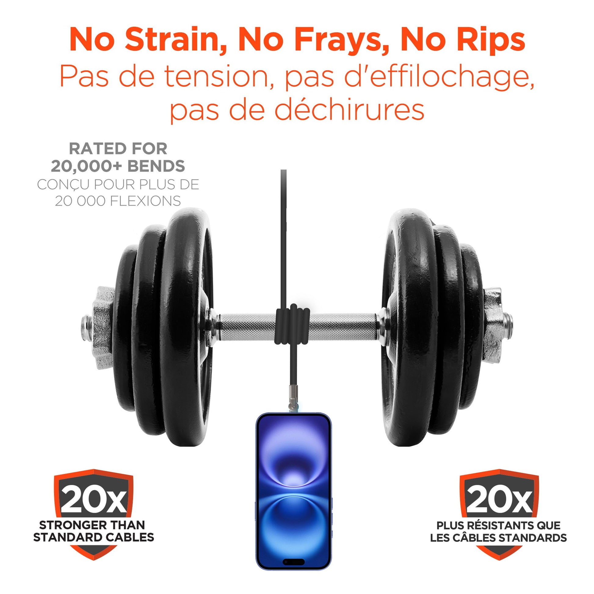 - 20X Stronger Than Standard Cables – Rated for 20,000+ Bends <