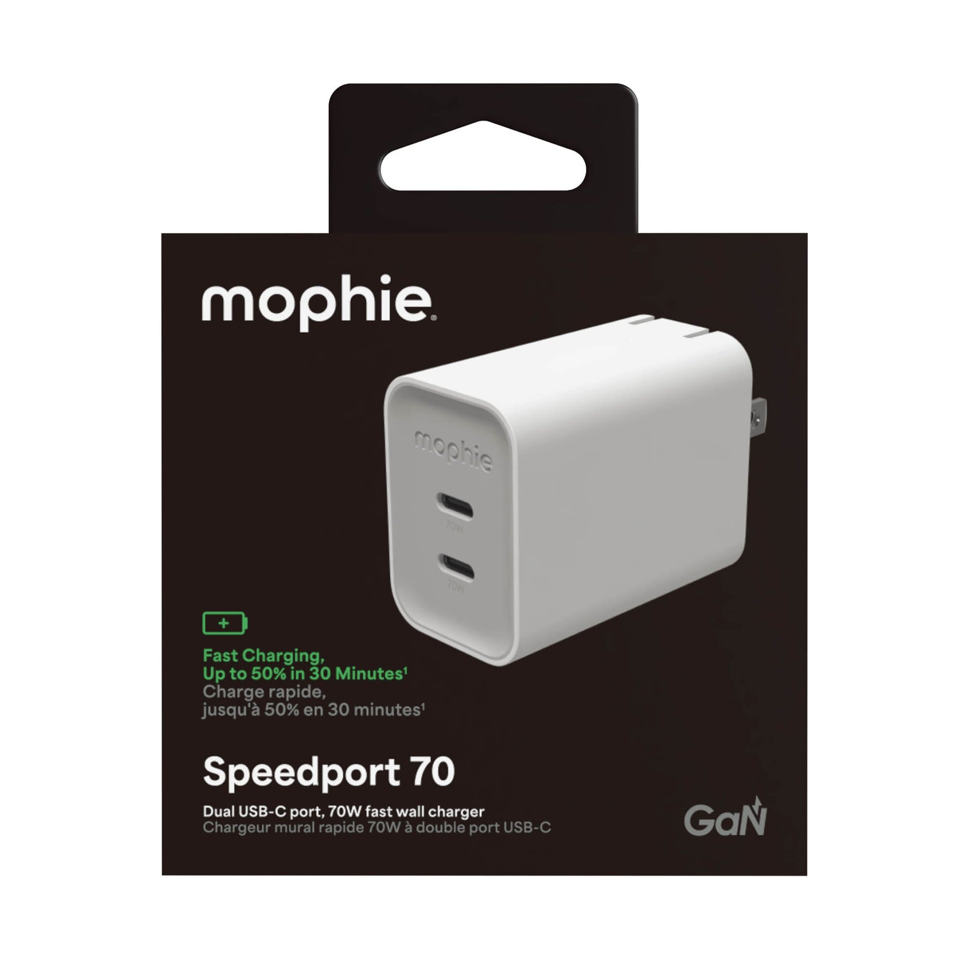 The Mophie Speedport 70W wall adapter features dual USB-C Power Delivery (PD) ports capable of a 70W shared output in a compact form factor.